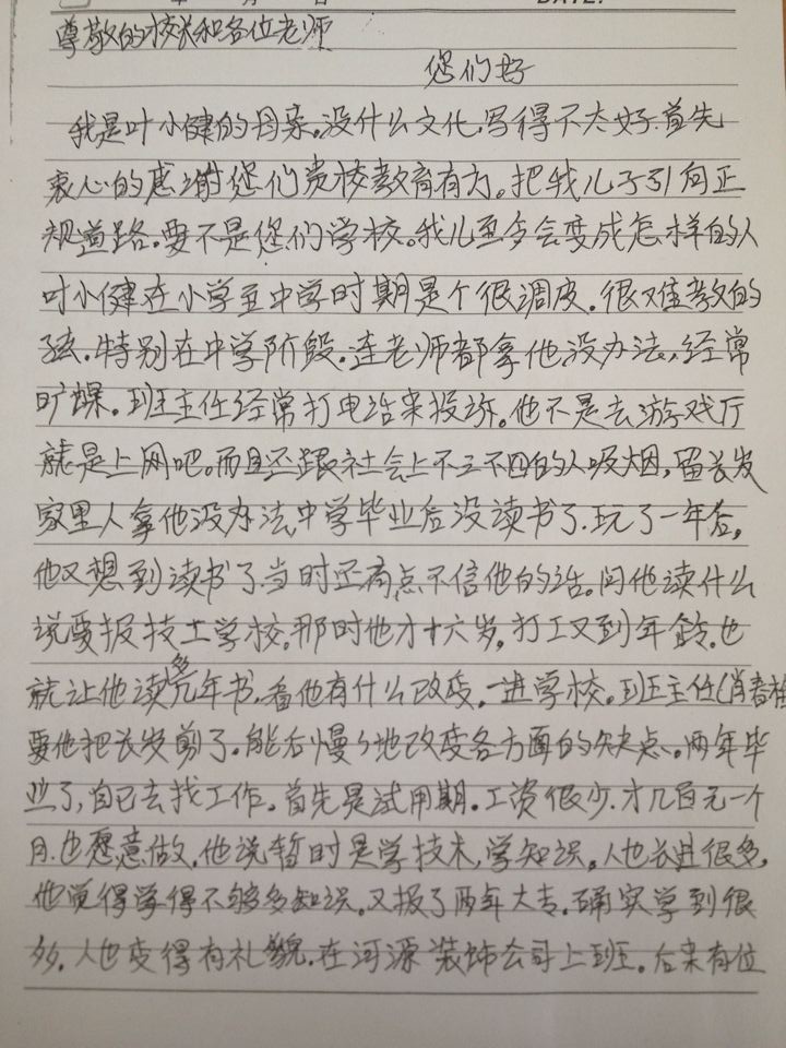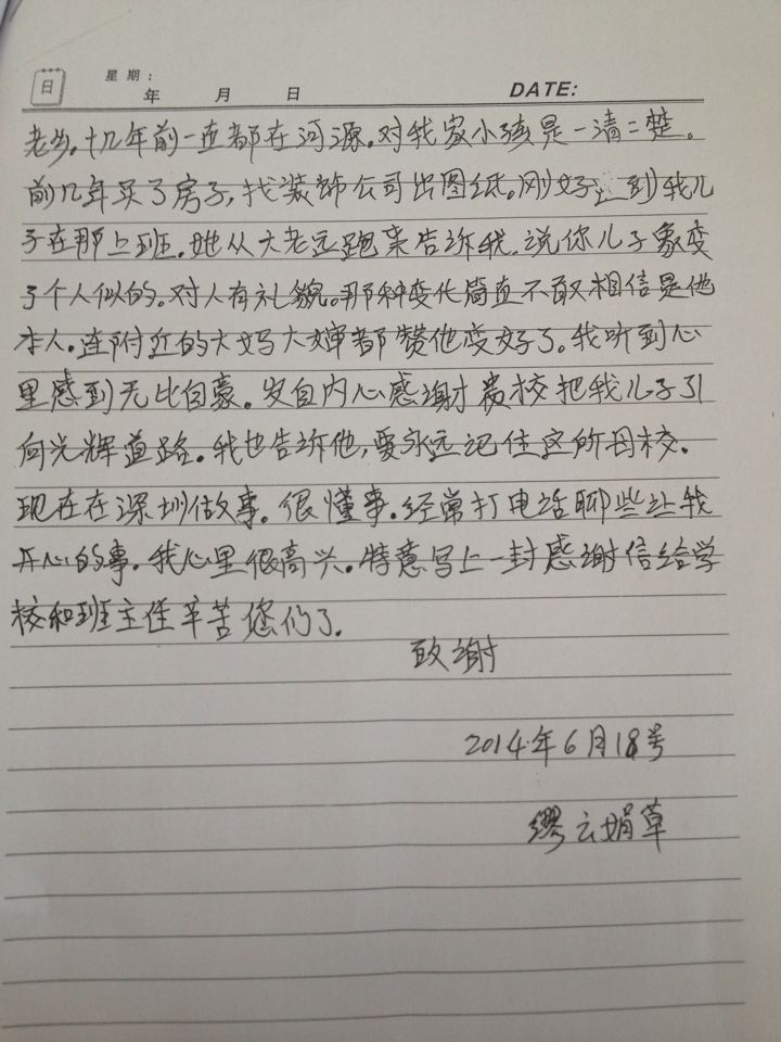 6月27日,學(xué)校收到了葉小健同學(xué)家長(zhǎng)繆云娟家長(zhǎng)發(fā)來的感謝信。信中,這位母親追憶兒子讀了技工學(xué)校后的轉(zhuǎn)變,表達(dá)了對(duì)學(xué)校、老師給予其小孩培養(yǎng)和幫助的感謝之情。