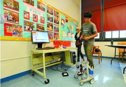 紐約布魯克林區(qū)一所科技職高P—TECH的學(xué)生在操作其制造的機(jī)器人