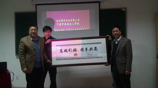 (圖一)黎海波校長(zhǎng)代表學(xué)校為杭州博洋科技有限公司贈(zèng)送牌匾